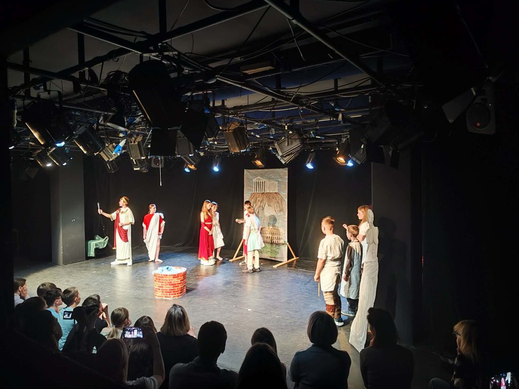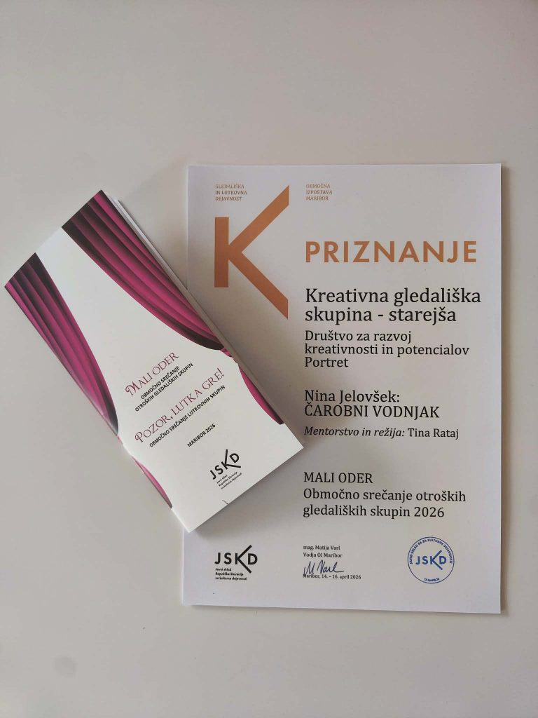 Starejša skupina Kreativne gledališke šole Portret se je včeraj, 16.4.2026 udeležila območnega srečanja otroških gledaliških skupin Mali oder, ki ga organizira JSKD Slovenije in je potekalo v SNG Maribor. Otroci so nastopili s predstavo Čarobni vodnjak, ki je nastajala skozi skupni ustvarjalni proces. Ob raziskovanju antične grške in rimske zgodovine so skozi zgodbo raziskovali teme moči, svobode, odnosov in vprašanje, ali lahko ljubezen in sprava najdeta pot tudi v najbolj nemirnih časih.